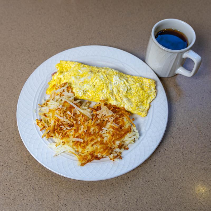 Green peppers, onions, & diced ham. Served with hash browns, toast & jelly.