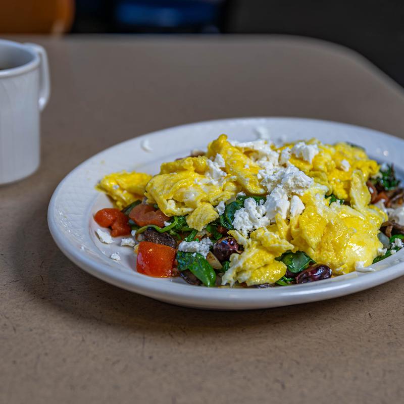 Two scrambled eggs over grilled mushrooms, green peppers, onion, tomato, spinach, black olives & feta cheese. Served with hash browns, toast & jelly.